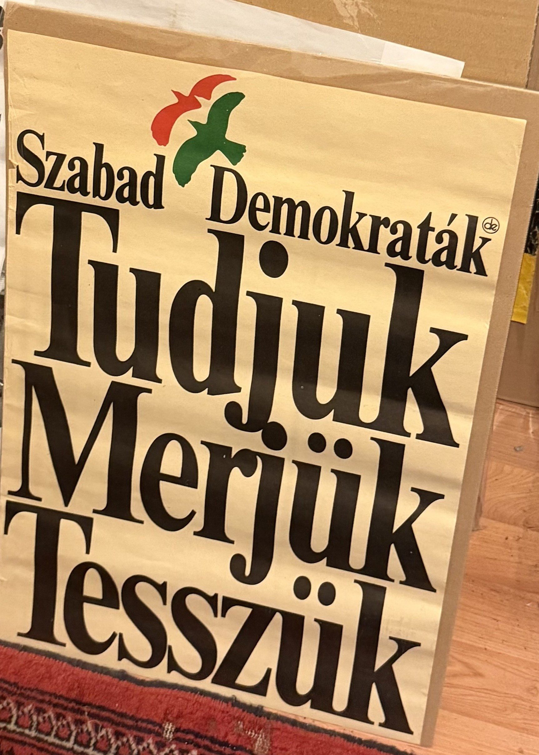 Nem tudok szó nélkül elmenni persze az 1989-90-es rendszerváltás idejében készült plakátok mellett sem: a legismertebb az MDF-es, „Tovarisi, konyec!” feliratú plakát, Orosz István grafikus zseniális munkája. Tirts Tamás, az aukció kurátora – fontos rendszerváltó politikus, aki tizenhat évig volt országgyűlési képviselő – személyesen is hozott egy meghatározó árverési darabot, amit 1991-ben kapott ajándékba Matvej Burlakov tábornoktól, a Mátyásföldön állomásozó szovjet alakulatok utolsó vezérlő tábornokától. Burlakov a hat magyar parlamenti párt képviselőinek rendezett ebédet, ez volt a búcsúajándéka. A plakát címe: „Minden jót, magyarok”.