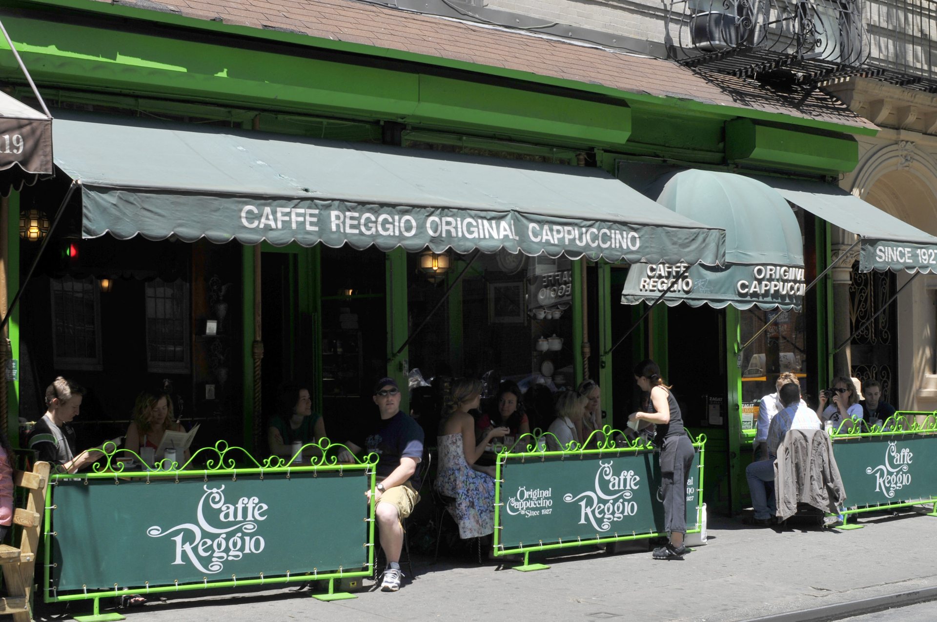 A Caffe Reggióban ücsörgünk, 119 MacDougal Street. Híres kávézó, 1927-ben nyitotta egy olasz emigráns, Domenico Parisi. Nem sokat változott azóta a hely, és ez a varázslata. Itt forgatták néhány komoly film részleteit– Keresztapa, Serpico és a Levél a Kremlbe.