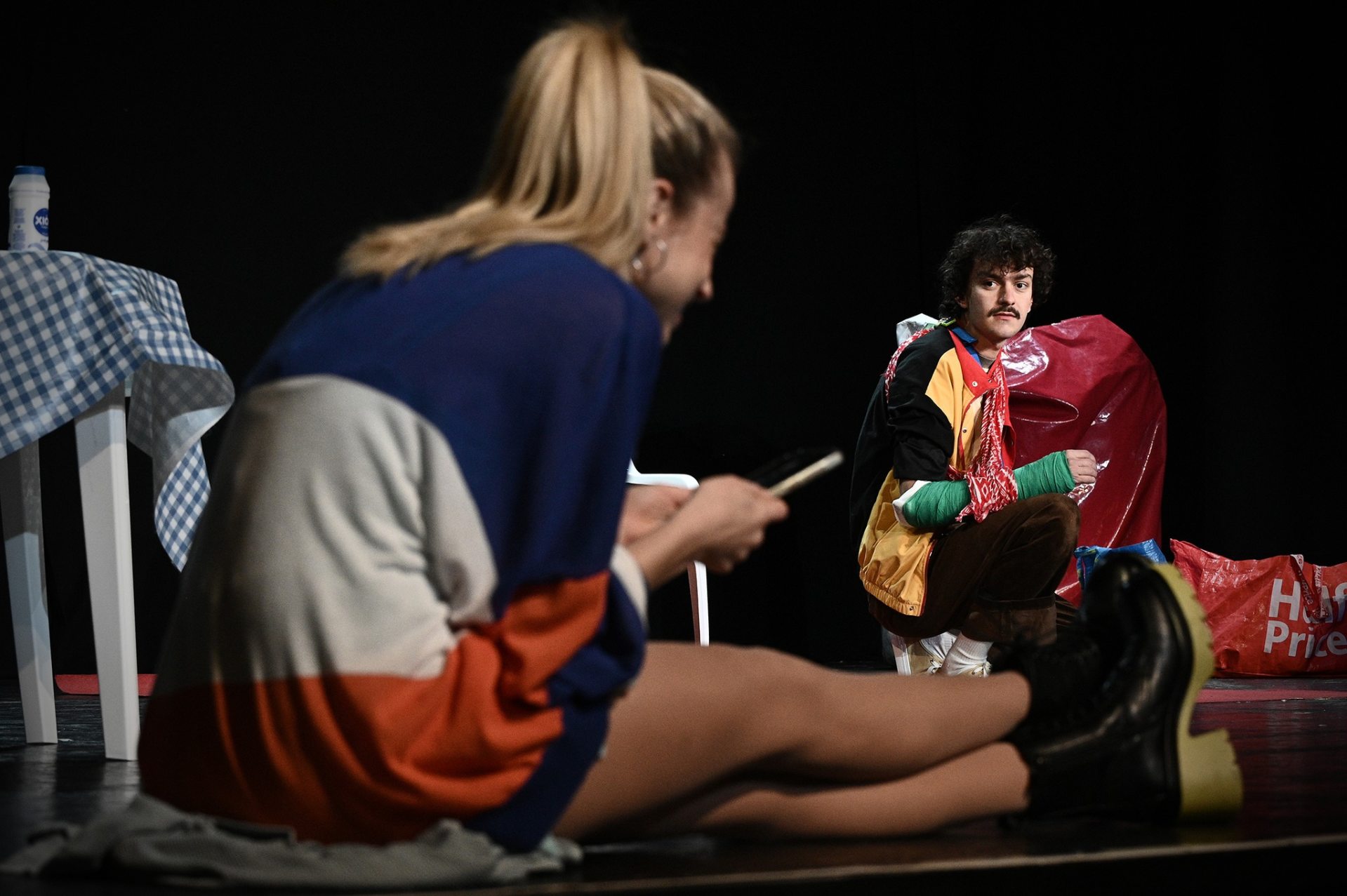 A második felvonásban Bruscon a maga által írt és rendezett A Történelem Kereke című darab néhány jelenetét próbálja újra a tanítványaival az utzbachi előadáshoz készülődve. A saját keresztnevén játszó László Lili és Németh Áron Valentin ügyesen ügyetlenkedik a riasztóan bamba pályakezdők szerepében – ez pedig alkalmat ad arra, hogy Bruscon ellenük is intézzen néhány szenvedélyes kirohanást és rendezői intelmet. Jól szórakozunk a mindennapos bullyingon (vajon miért?), amelynek elkövetője itt nemcsak abuzív szörnyetegnek, de időnként nagy tudású színházi autoritásnak tűnik. Csakhogy madarat tolláról, mestert tanítványáról – ahogy arra Bruscon is egy helyütt önironikusan utal. És hát Lili és Áron nem csupán tehetségtelenek, de konkrétan háziállatokra emlékeztetnek. Mintha nem beszélnék az emberi (vagy a színházi, de legalábbis a brusconi) nyelvet. Még a főnökük rövid távollétében sem váltanak egymással egyetlen mondatot sem – csupán mimikával, gesztusokkal és tánccal kommunikálnak. Úgy hajtanak végre utasítást, úgy játszanak, úgy fogadják a dicséretet és a fegyelmezést, mint a kutyák, akik egy életre a gazdájuk mellé szegődtek. A színpadon két jópofa, kissé idétlenül öltözött fiatalt látunk – Juristovszky Sosa kiváló jelmezeiben –, mégis hihetetlenül szomorú elképzelni ezt az életet, melynek folytatása valószínűleg a Buza Tímea által alakított Agathééhoz lesz hasonló, aki folyton köhögő, gyűlölködő tekintettel kóválygó, mesterét mégis alázattal öltöztető-vetkőztető félhullaként tűnik fel egy-egy rövid epizód erejéig az előadásban.