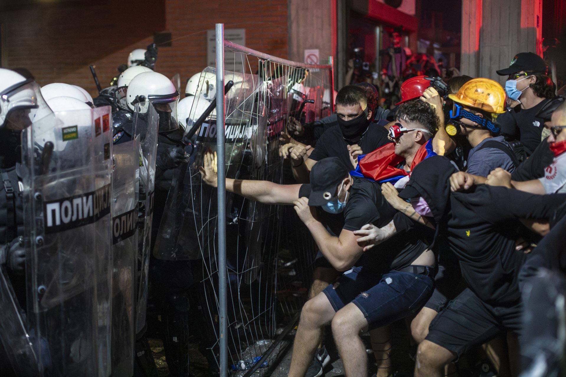 A belügyminisztérium, Aleksandar Vučić szerb elnök és a rendszer médiája a fordítottját állítják. Szerintük huligánok, anarchisták és terroristák ok nélkül támadják a rendőröket azzal a céllal, hogy még nagyobb zavargásokat, sőt véres polgárháborút provokáljanak ki.