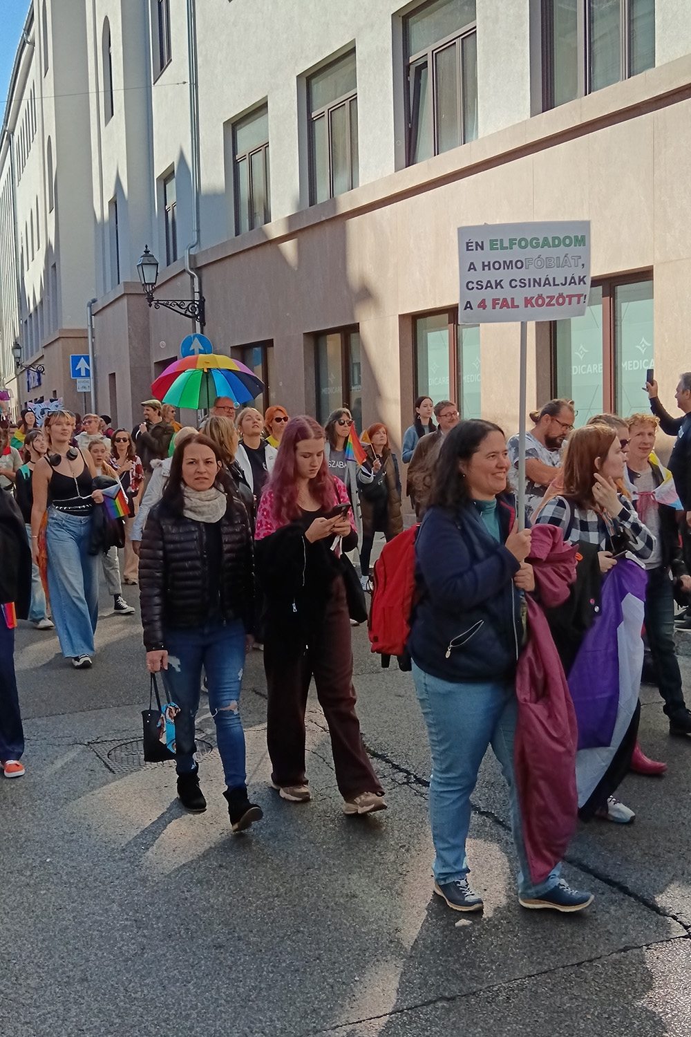 A nem-budapesti viszonylatban hatalmas menetben így gyakran lehetett találkozni a pusztán Orbán-ellenes tüntetők csoportjaival is, akik jelszavaikban is a kemény ellenzéki szekciót képviselték: Hatvanpuszta, „Zsolti bácsi”, gyermekvédelem, vagy éppen a közpénzlopás ellen tiltakozó táblákkal. Ők viszont jól megfértek például azokkal a jórészt nagyon-nagyon fiatal felvonulókkal, akik palesztin zászlót is hoztak, jelezve, az emberiesség elleni gázai bűnök, amiket Izrael követ el, ugyanolyan felháborítóak, mint a Pride üldözése, és mindenkinek mindenhol szolidárisnak kellene lennie mindenkivel.